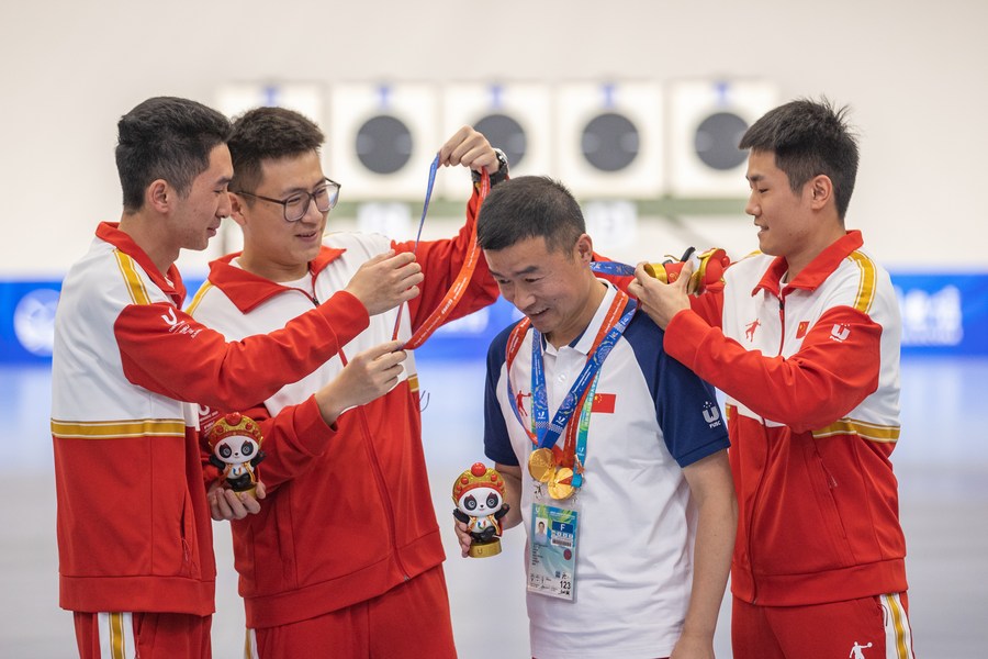 Members of Team China present medals to the coach after winning the men's 25m rapid fire pistol team final at the 31st FISU Summer World University Games in Chengdu, southwest China's Sichuan Province, July 30, 2023. (Xinhua/Huang Wei)