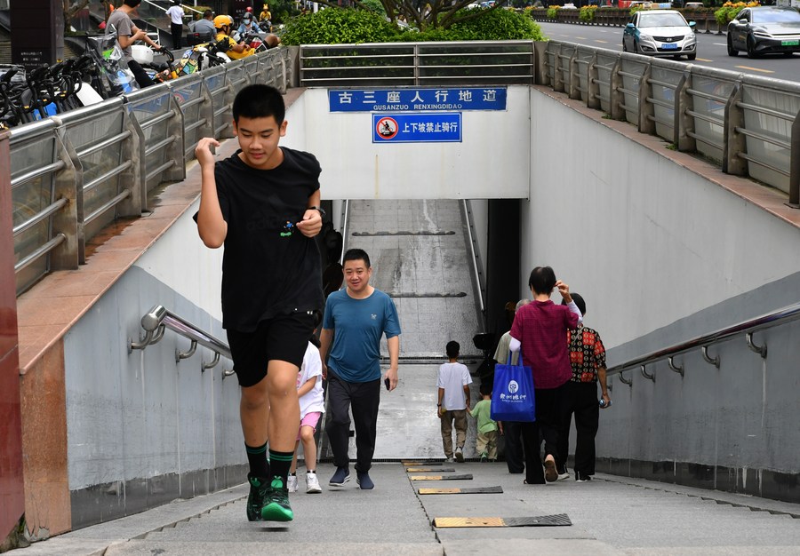 Citizens pass through an underpass in Fuzhou, southeast China's Fujian Province, July 30, 2023. Fuzhou has seen its urban life gradually back to normal after typhoon Doksuri swept through the city. (Xinhua/Wei Peiquan)
