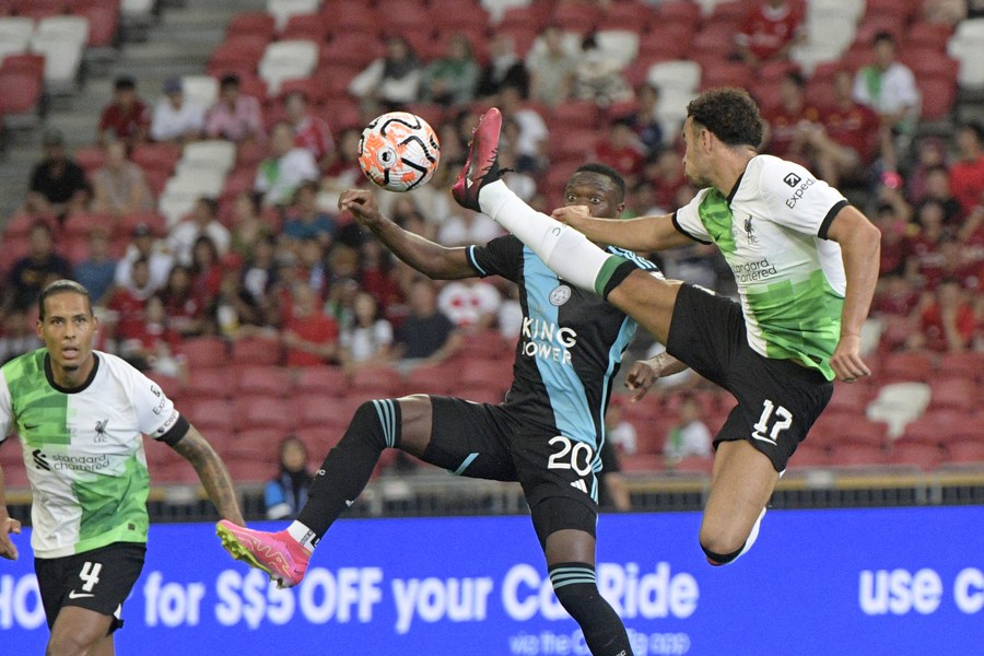Curtis Jones (R) of Liverpool competes with Patson Daka (C) of Leicester City during the match between English Premier League team Liverpool and English Football League team Leicester City at the Singapore Festival of Football held at National Stadium in Singapore on July 30, 2023. (Photo by Then Chih Wey/Xinhua)