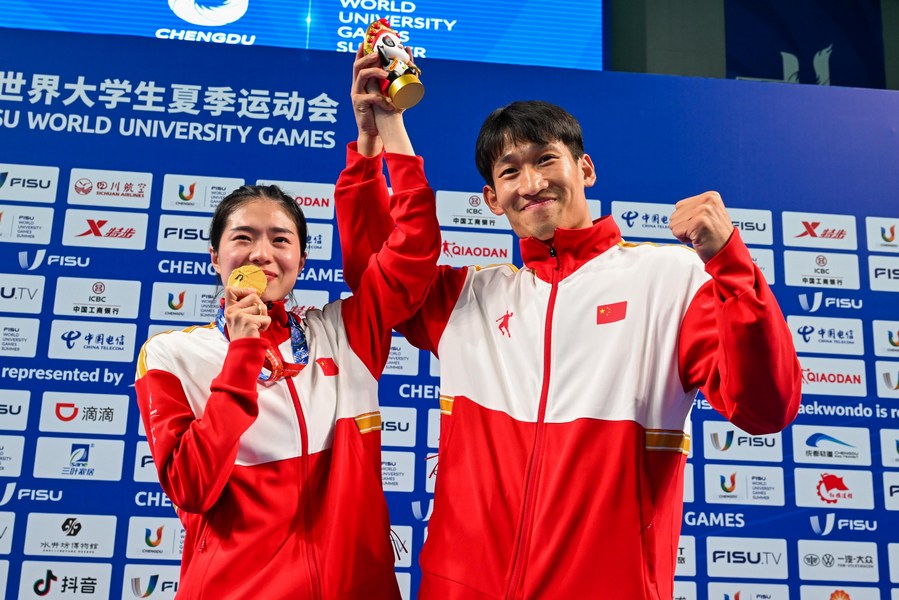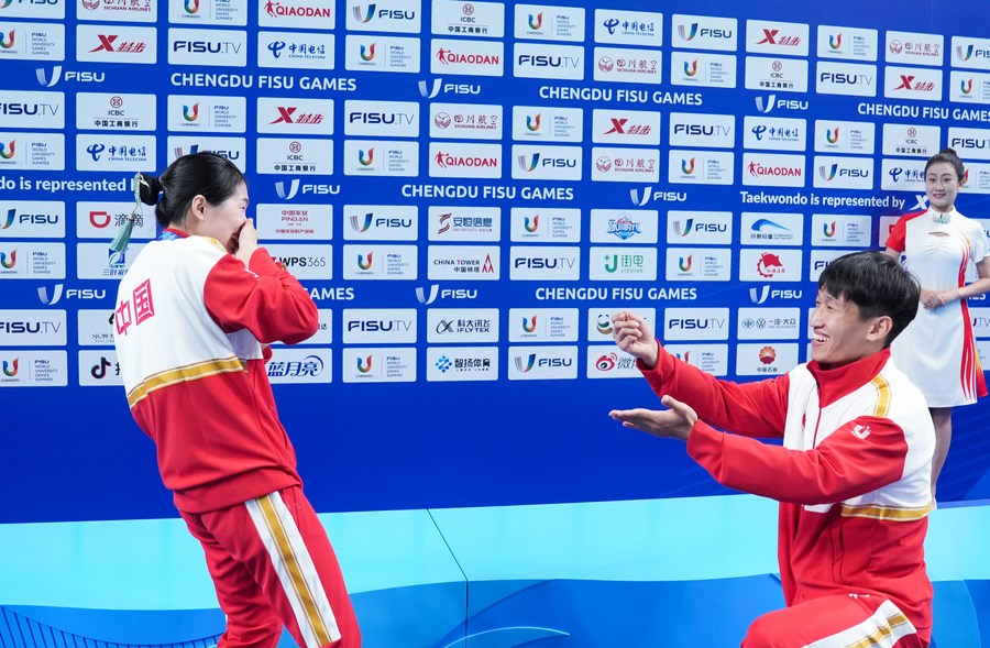 CHENGDU, July 31 (Xinhua) -- Chinese taekwondo athlete Liang Jie not only obtained a gold medal at the 31st FISU World University Games but also received an unexpected marriage proposal at the medal awarding ceremony, adding a ring to her collection.