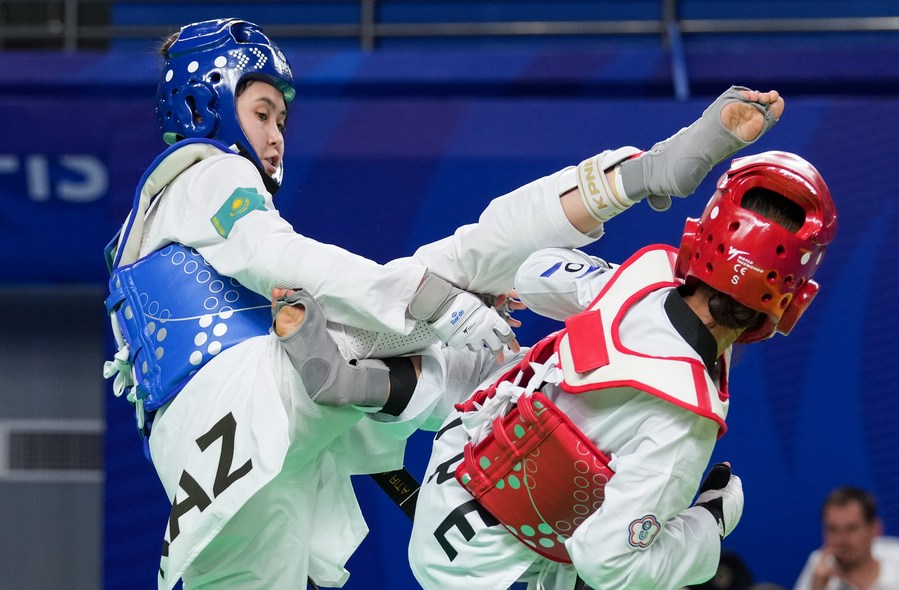 Rita Bakisheva of Kazakhstan (L) fights against Huang Ying-hsuan of Chinese Taipei during the taekwondo women's 46kg final at the 31st FISU Summer World University Games in Chengdu, southwest China's Sichuan Province, July 31, 2023. (Xinhua/Jiang Hongjing)