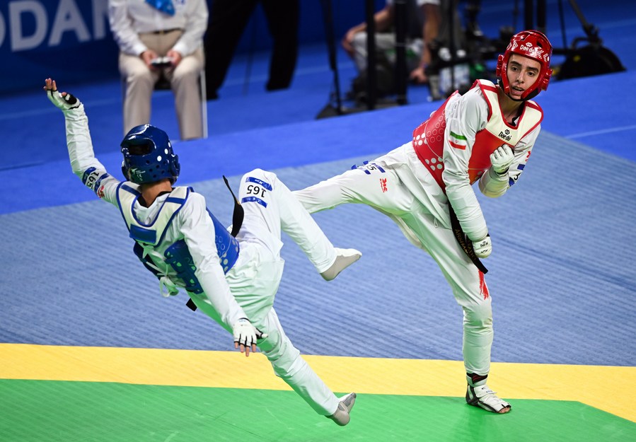 Mahdi Hajimousaeinafouti (R) of Iran fights against Omonjon Otajonov of Uzbekistan during the taekwondo men's 54kg final at the 31st FISU Summer World University Games in Chengdu, southwest China's Sichuan Province, July 31, 2023. (Xinhua/Liu Lei)