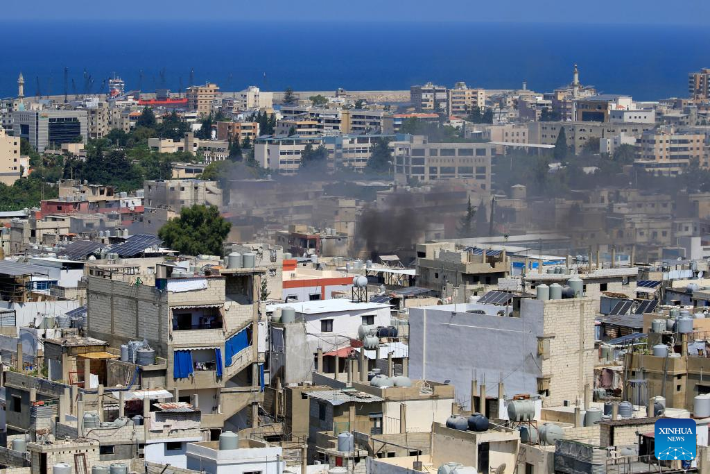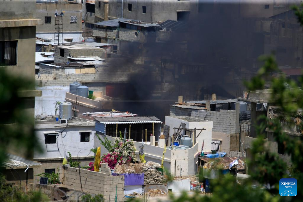 Smoke rises above the Ain Al-Helweh camp in south Lebanon, July 31, 2023. (Photo by Ali Hashisho/Xinhua)
