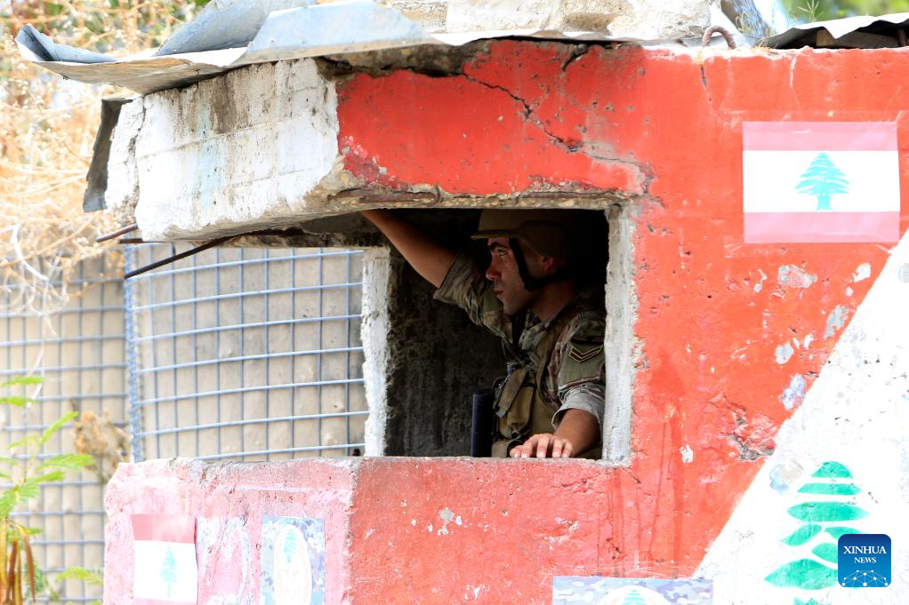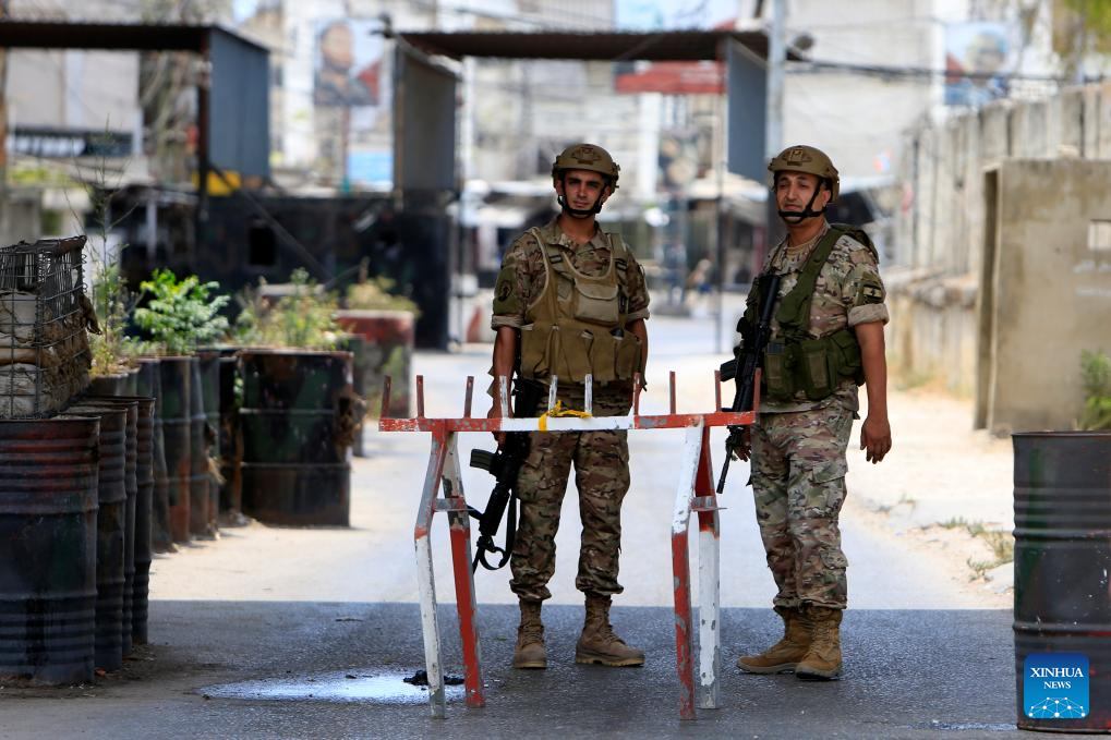 Lebanese soldiers are on duty on the border of the Ain Al-Helweh camp in south Lebanon, July 31, 2023. (Photo by Ali Hashisho/Xinhua)