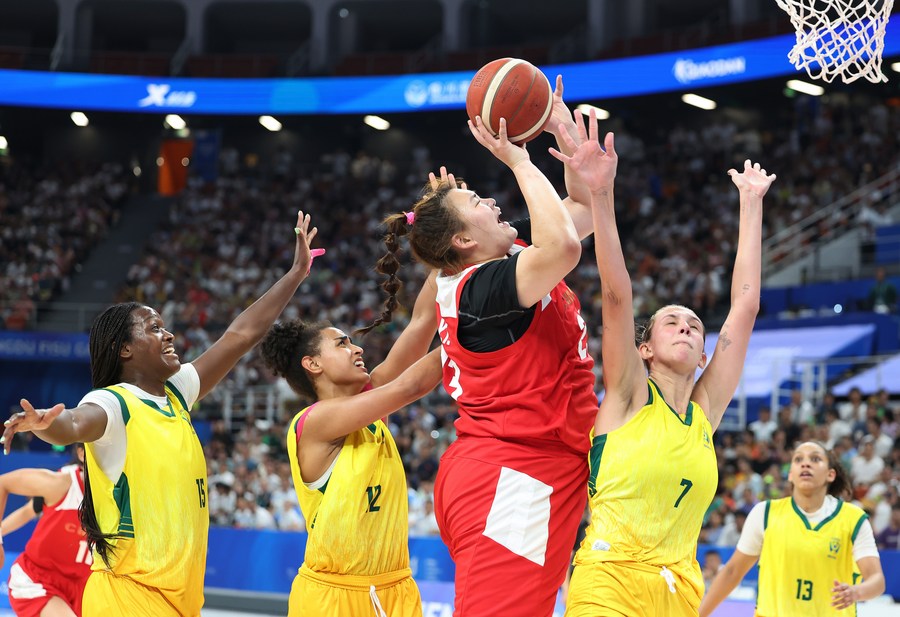 Liu Yutong of China goes for the bucket against Brazil during the women's basketball quarterfinals at the Chengdu Universiade, August 1, 2023. (Xinhua/Yang Qing)