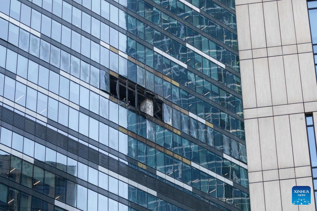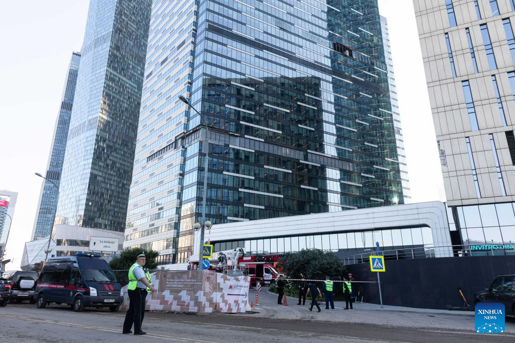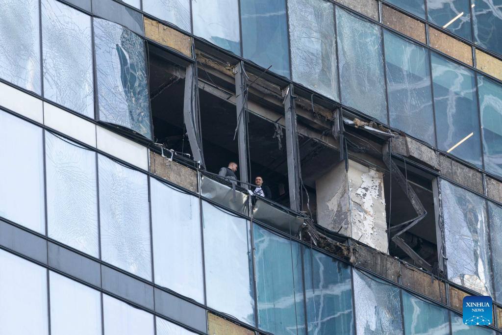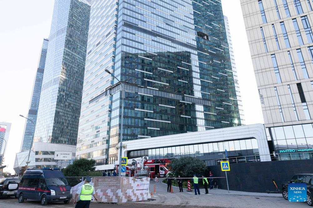 This photo taken on Aug. 1, 2023 shows a building damaged in a drone attack in Moscow, Russia. Ukraine launched an attack on Moscow and the Moscow region with three unmanned aerial vehicles (UAVs), with two of them shot down and the third having crashed after being jammed by electronic warfare, said Russian authorities on Tuesday. (Xinhua/Bai Xueqi)