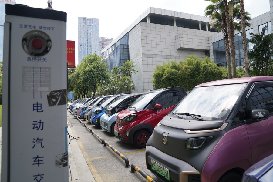 This photo taken on July 5, 2023 shows a charging station for new energy vehicles (NEVs) in Liuzhou City, south China's Guangxi Zhuang Autonomous Region. (Xinhua/Guo Yifan)