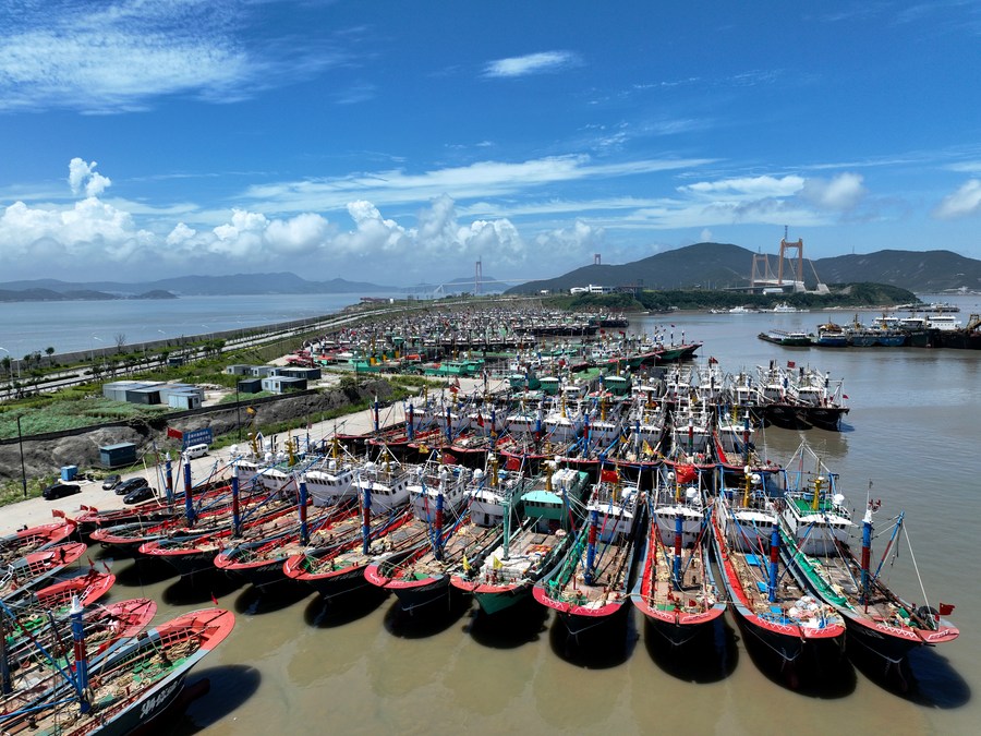 This aerial photo shows fishing boats taking shelter from the approaching Typhoon Khanun at a harbor in Daishan County, Zhoushan City, east China's Zhejiang Province, July 31, 2023. (Photo by Yao Feng/Xinhua)