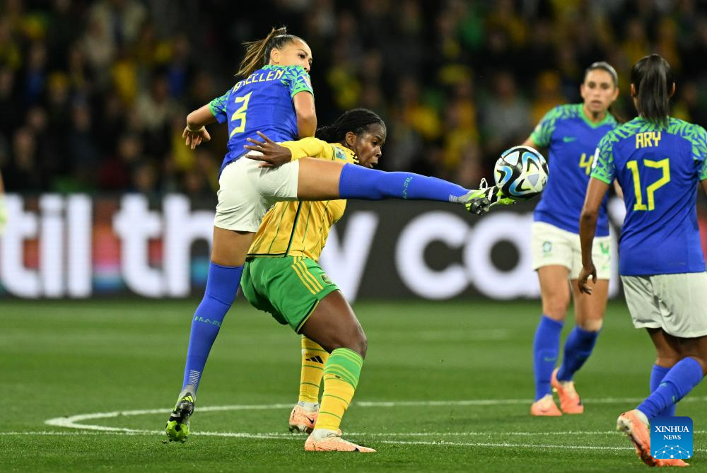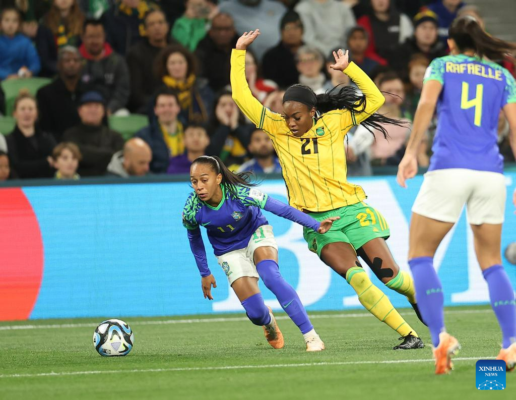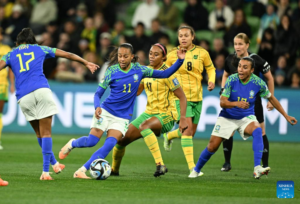 Brazil's Adriana (2nd L) competes during the Group F match between Jamaica and Brazil at the 2023 FIFA Women's World Cup in Melbourne, Australia, Aug. 2, 2023. (Xinhua/Mao Siqian)