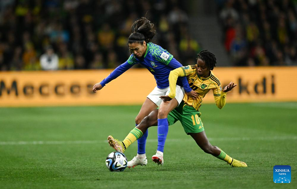 Brazil's Antonia (L) vies with Jamaica's Jody Brown during the Group F match between Jamaica and Brazil at the 2023 FIFA Women's World Cup in Melbourne, Australia, Aug. 2, 2023. (Xinhua/Mao Siqian)
