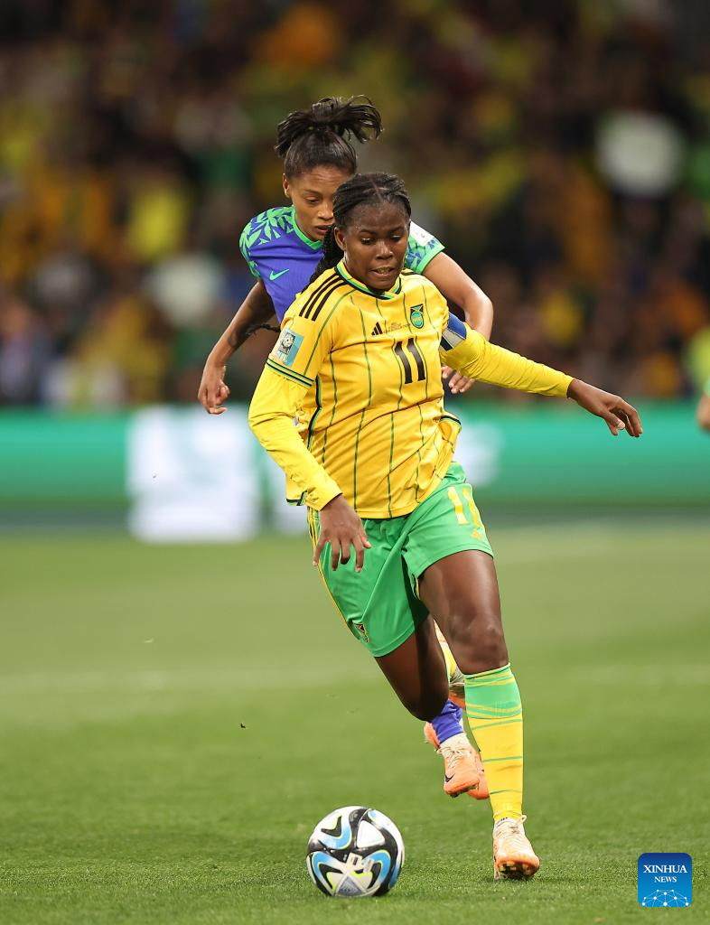 Jamaica's Khadija Shaw (front) competes during the Group F match between Jamaica and Brazil at the 2023 FIFA Women's World Cup in Melbourne, Australia, Aug. 2, 2023. (Xinhua/Ding Xu)