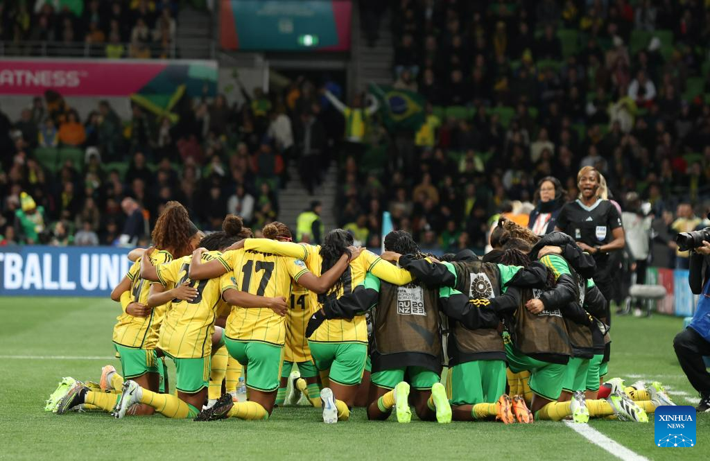 Players of Jamaica react before the Group F match between Jamaica and Brazil at the 2023 FIFA Women's World Cup in Melbourne, Australia, Aug. 2, 2023. (Xinhua/Ding Xu)