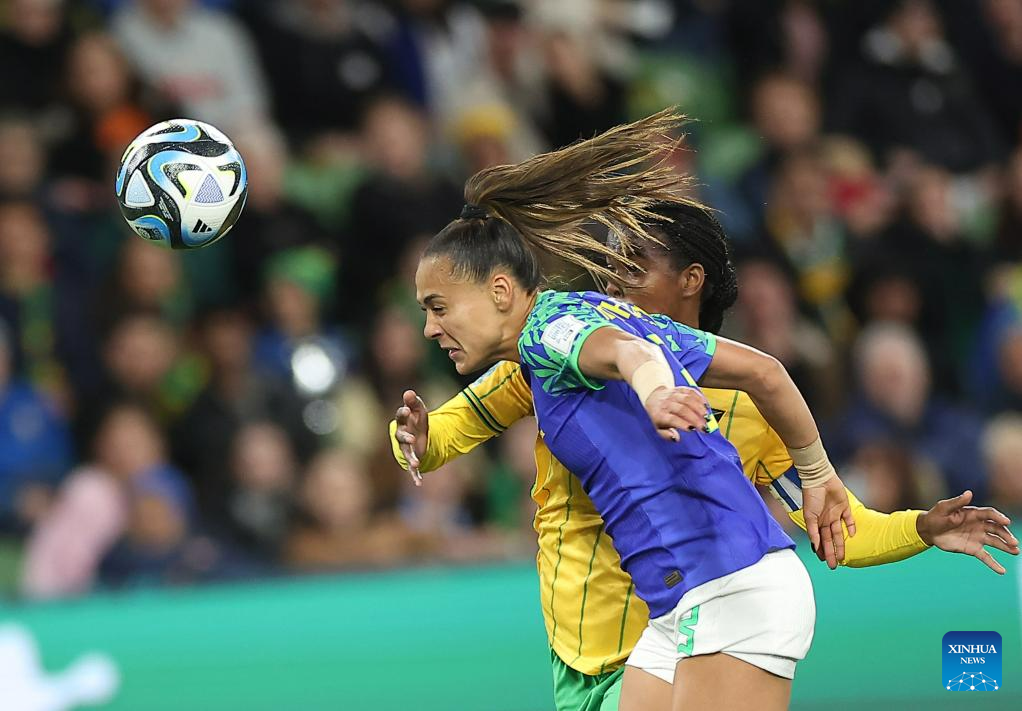 Brazil's Kathellen (front) vies for a header during the Group F match between Jamaica and Brazil at the 2023 FIFA Women's World Cup in Melbourne, Australia, Aug. 2, 2023. (Xinhua/Ding Xu)