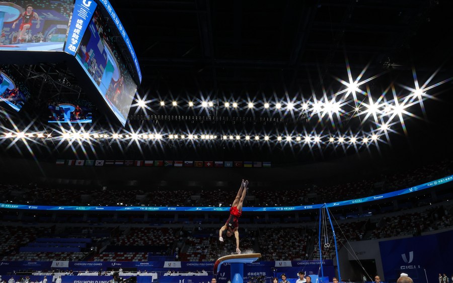 Kazuma Kaya of Japan competes in the vault during the artistic gymnastics men's team final at the 31st FISU Summer World University Games in Chengdu, southwest China's Sichuan Province, Aug. 2, 2023. (Xinhua/Wang Jingqiang)