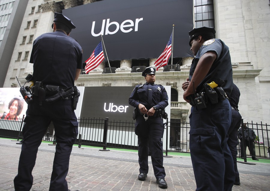 Banners of Uber Technologies Inc. are seen hanging outside the New York Stock Exchange in New York, the United States, May 10, 2019. (Xinhua/Wang Ying)