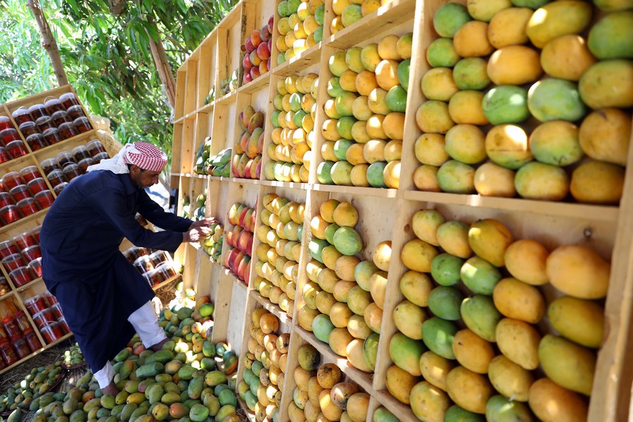A farmer arranges newly-harvested mangos at a farm in Ismailia Governorate, Egypt, Aug. 1, 2023. (Xinhua/Ahmed Gomaa)