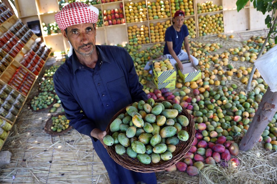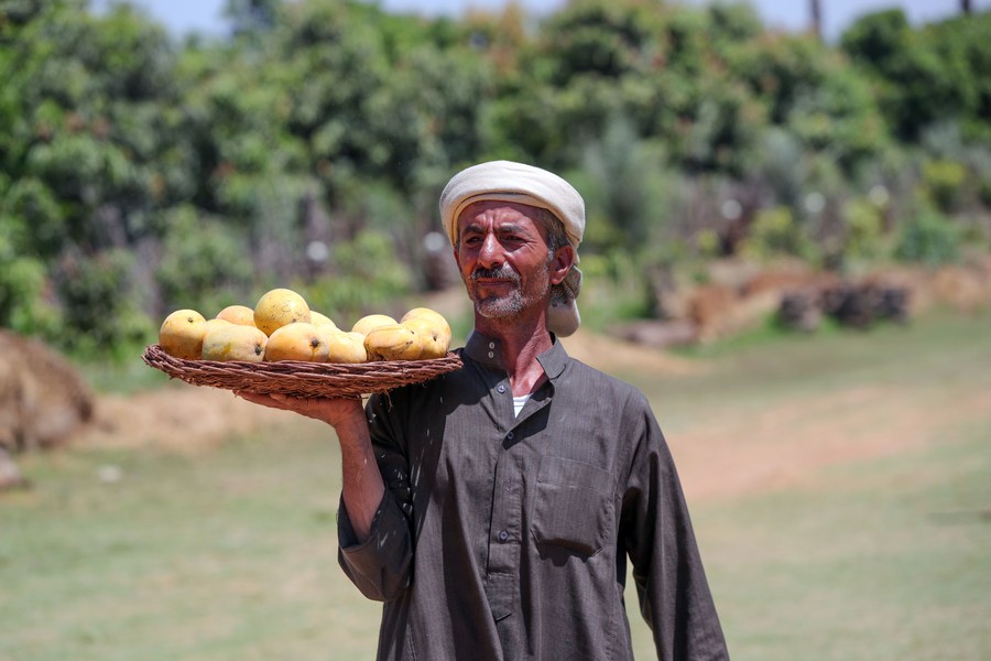 A farmer shows newly-harvested mangos at a farm in Ismailia Governorate, Egypt, Aug. 1, 2023. (Xinhua/Ahmed Gomaa)