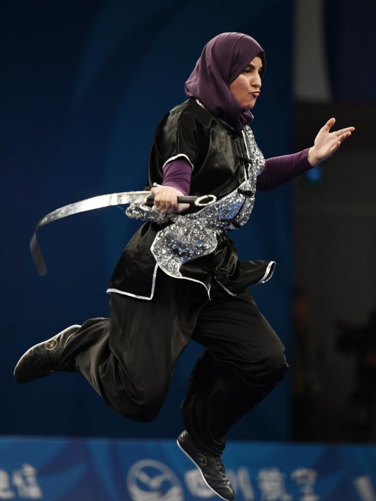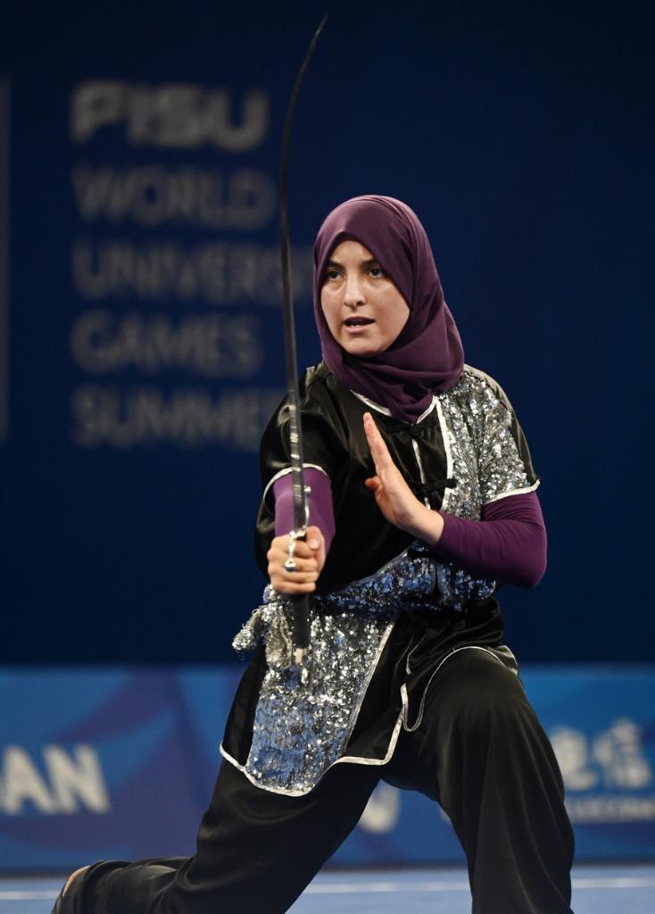 Louiza Ait Mouloud of Algeria competes in the Wushu women's Nandao at the 31st FISU Summer World University Games in Chengdu, southwest China's Sichuan Province, July 29, 2023. (Xinhua/Wu Gang)