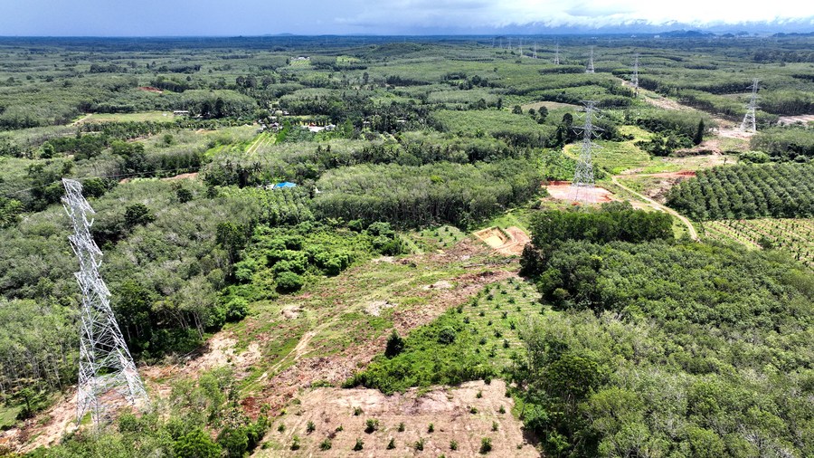 Aerial photo taken on July 11, 2023 shows the transmission towers in Nakhon Si Thammarat, Thailand. (Xinhua/Wang Teng)