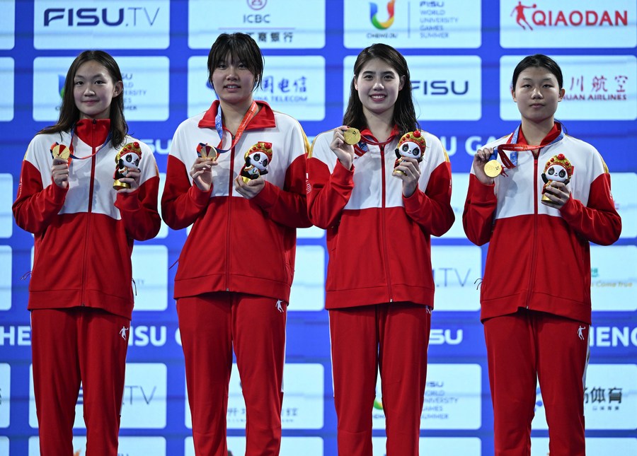 Li Bingjie, Liu Yaxin, Zhang Yufei, and Luo Youyang (L to R) pose on the podium during the awarding ceremony for women's 4x100m freestyle relay at the Chengdu Universiade on Aug. 1, 2023. (Xinhua/Zhang Long)