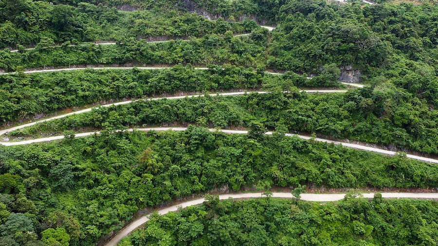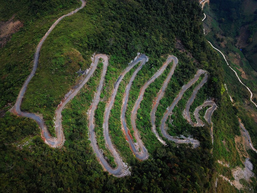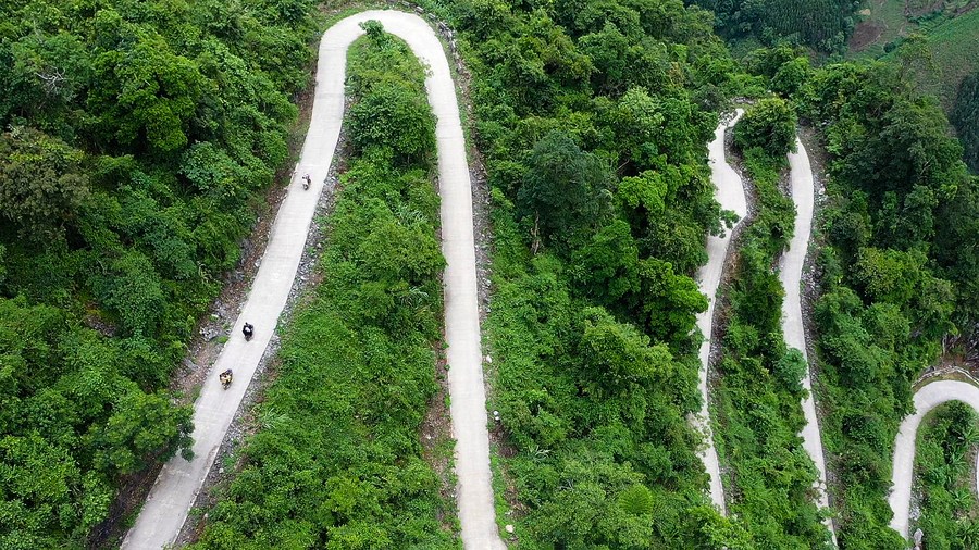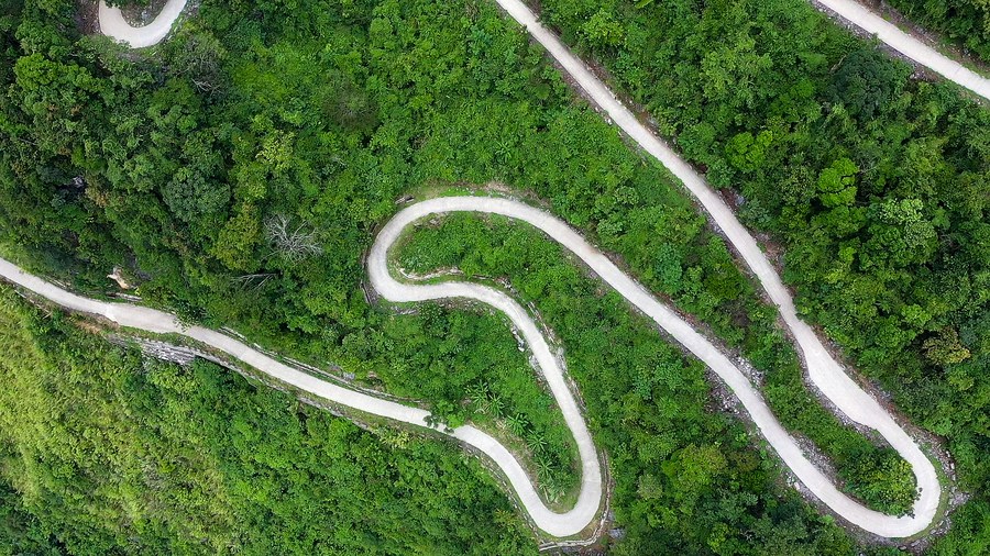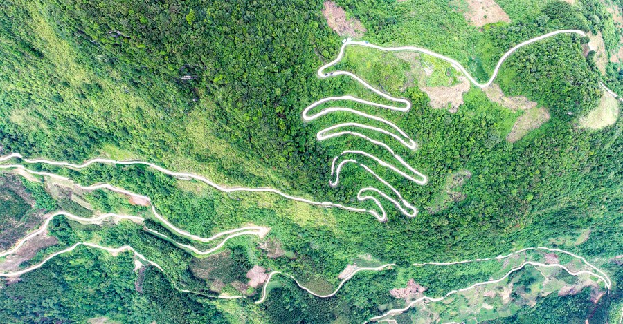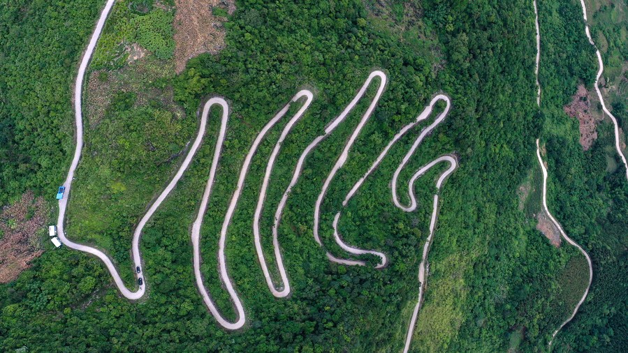 This aerial photo taken on July 31, 2023 shows a winding mountain road in Napo County, south China's Guangxi Zhuang Autonomous Region. (Xinhua/Zhang Ailin)