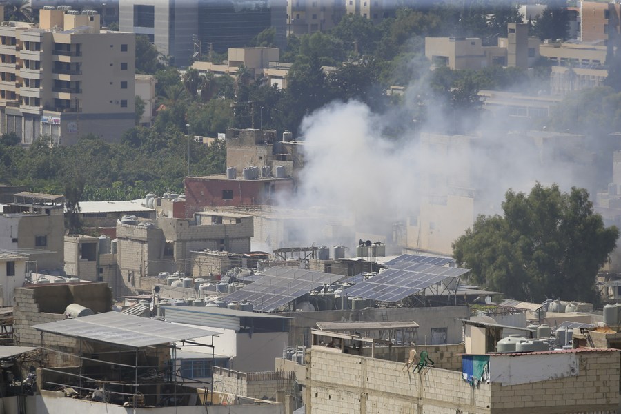 Smoke billows from burning houses in the Ain al-Helweh refugee camp near Sidon, southern Lebanon, on Aug. 1, 2023. (Photo by Ali Hashisho/Xinhua)