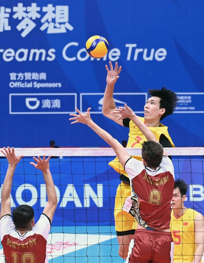 Peng Shikun (Up) of China spikes during the men's volleyball Group C match against Azerbaijan at the Chengdu Universiade, August 2, 2023. (Xinhua/Cai Xiangxin)