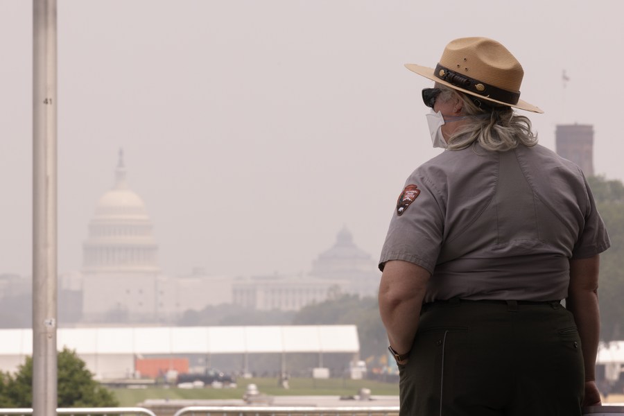 A National Park ranger wearing a face mask is seen at the Washington Monument in Washington, D.C., the United States, on June 29, 2023. (Photo by Aaron Schwartz/Xinhua)