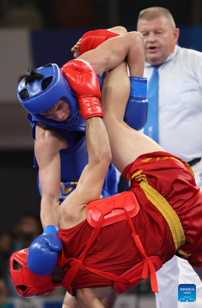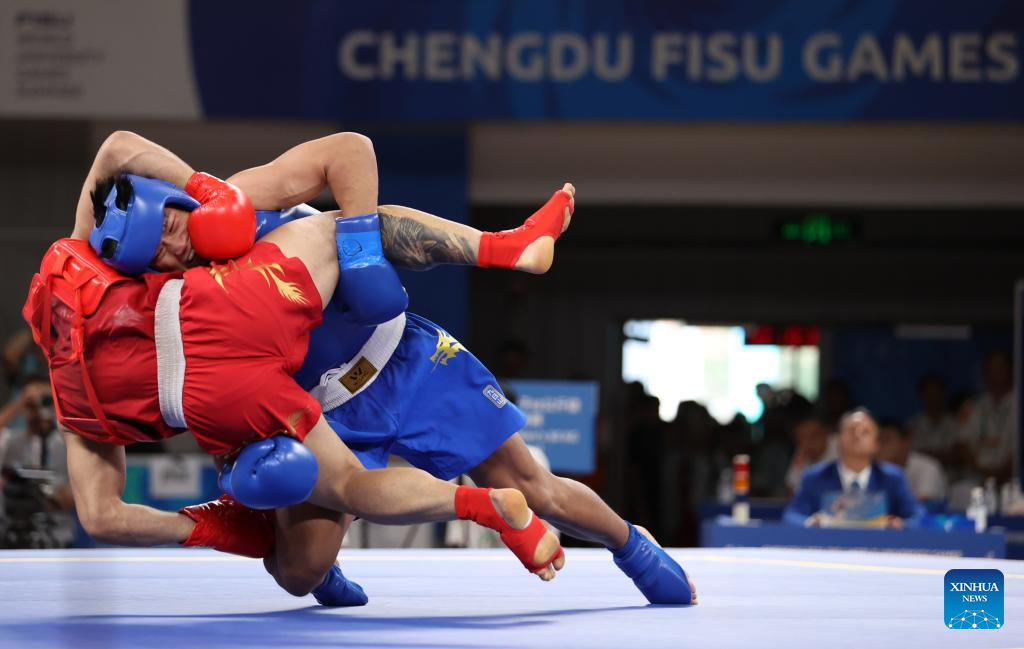 He Feng (top) of China competes with Hamidreza Sahandi of Iran during the Wushu Men's 70kg Final at the 31st FISU Summer World University Games in Chengdu, southwest China's Sichuan Province, Aug. 3, 2023. (Xinhua/Jia Haocheng)