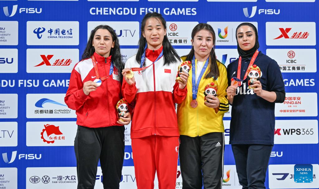 Berna Tut (1st L) of Türkiye, Li Zhiqin (2nd L) of China, Aigerim Torekhanova (2nd R) of Kazakhstan and Mohana Rahimi of Iran react after the medal ceremony for the Wushu Women's 60kg Final at the 31st FISU Summer World University Games in Chengdu, southwest China's Sichuan Province, Aug. 3, 2023. (Xinhua/Jigme Dorji)