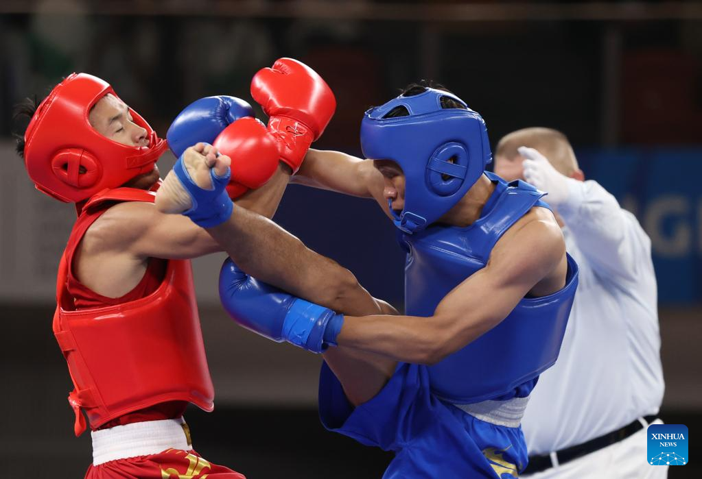 Ma Yigu (L) of China vies with Bintang Reindra Nada Guitara of Indonesia during the Wushu Men's 60kg Final at the 31st FISU Summer World University Games in Chengdu, southwest China's Sichuan Province, Aug. 3, 2023. (Xinhua/Jia Haocheng)