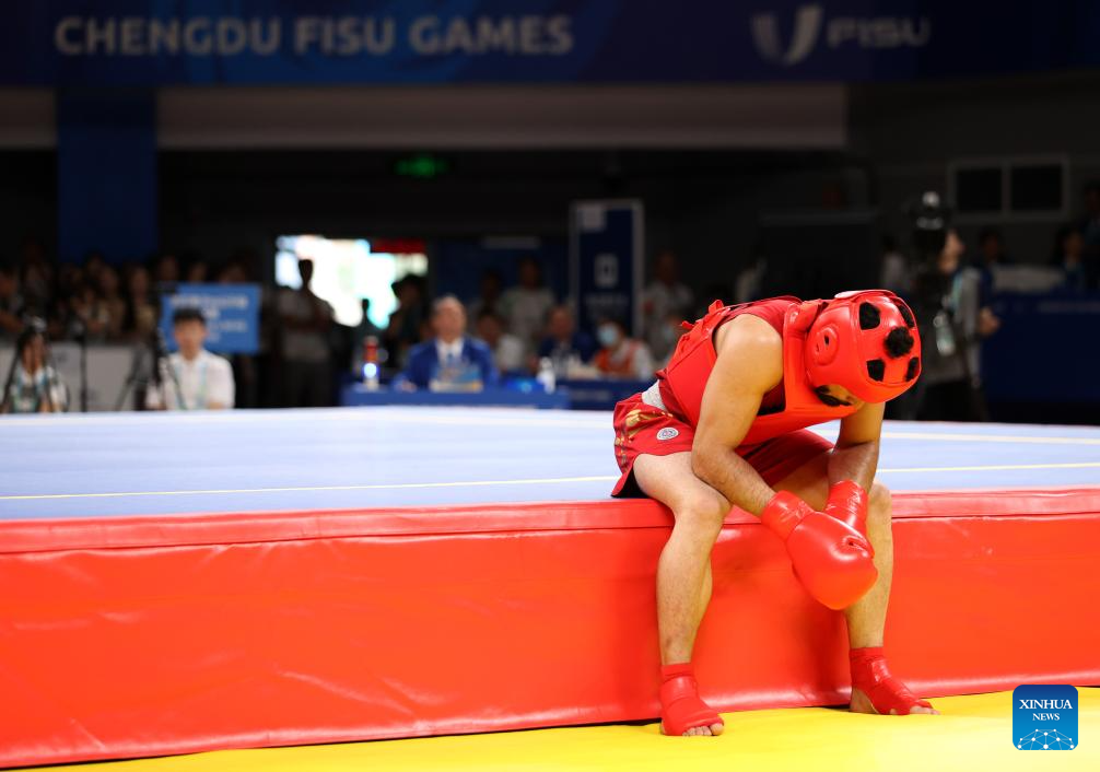 Ali Khorshidirabie of Iran reacts after the Wushu Men's 80kg Final at the 31st FISU Summer World University Games in Chengdu, southwest China's Sichuan Province, Aug. 3, 2023. (Xinhua/Jia Haocheng)