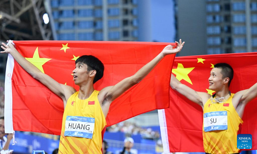 Bronze medalist Huang Huafeng (L) of China and gold medalist Su Wen of China celebrate after the athletics men's triple jump final at the 31st FISU Summer World University Games in Chengdu, southwest China's Sichuan Province, Aug. 3, 2023. (Xinhua/Deng Hua)
