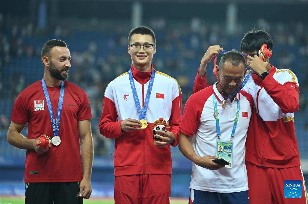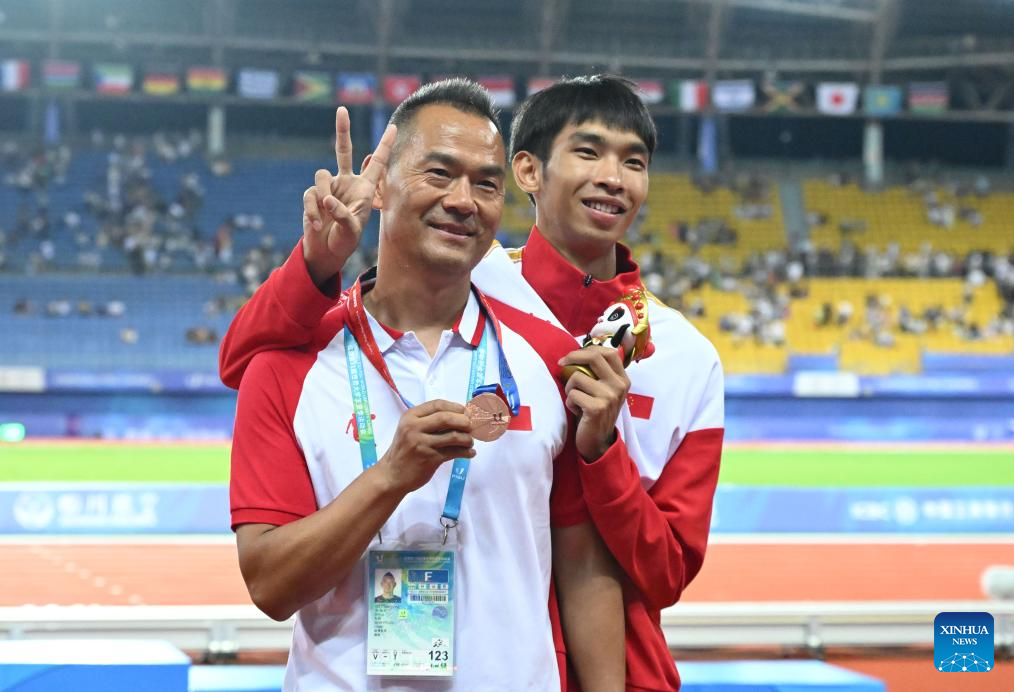 Bronze medalist Huang Huafeng (R) of China celebrates with coach Yu Changqing during the awarding ceremony for the athletics men's triple jump final at the 31st FISU Summer World University Games in Chengdu, southwest China's Sichuan Province, Aug. 3, 2023. (Xinhua/Cai Xiangxin)