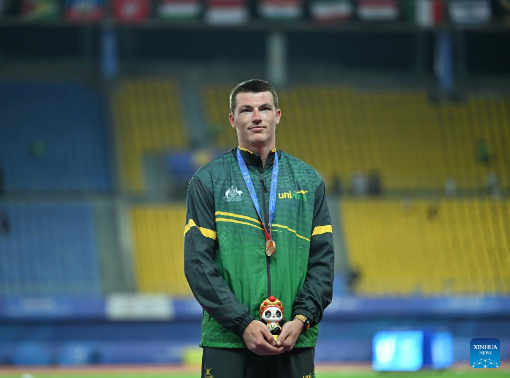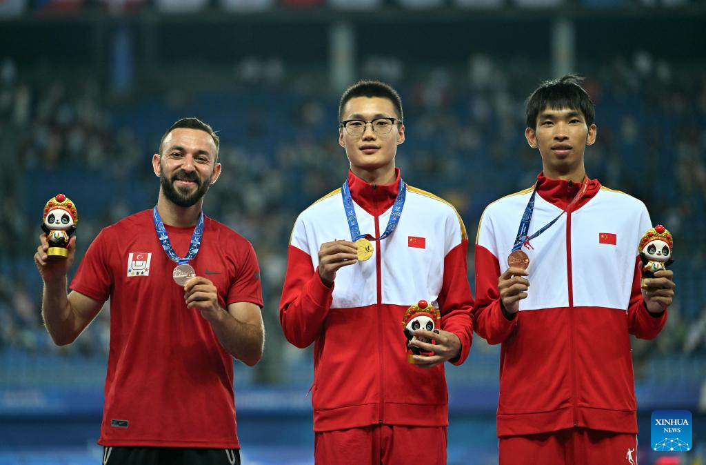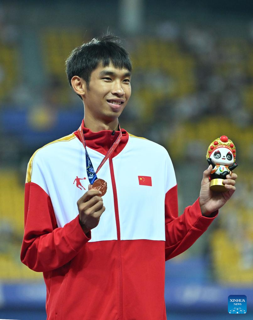 Bronze medalist Huang Huafeng of China celebrates during the awarding ceremony for the athletics men's triple jump final at the 31st FISU Summer World University Games in Chengdu, southwest China's Sichuan Province, Aug. 3, 2023. (Xinhua/Cai Xiangxin)