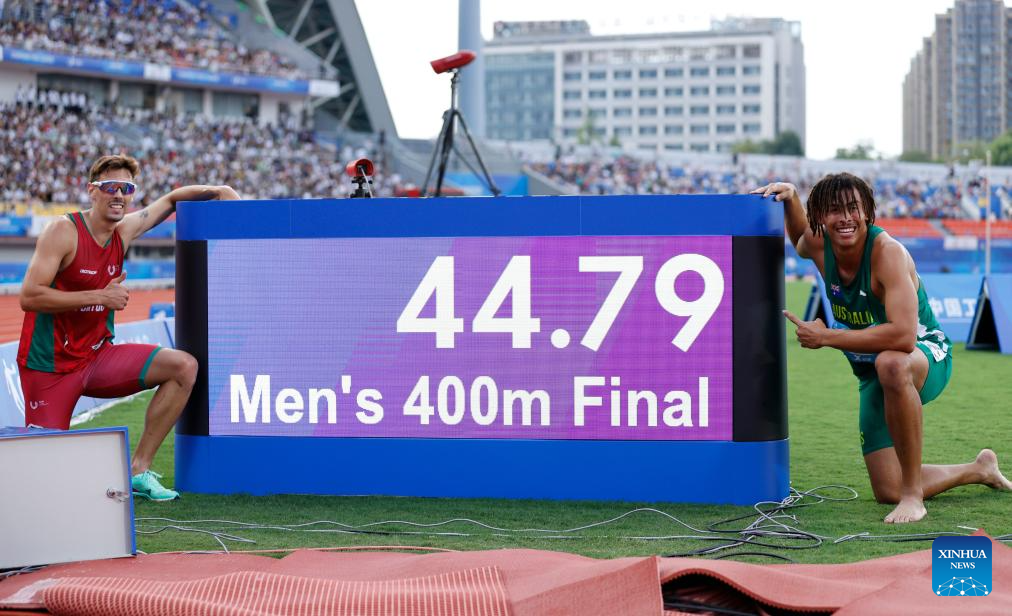 Gold medalist Joao Ricardo Agostinho Coelho (L) of Portugal and silver medalist Reece Nathaniel Holder of Australia take photos with the time board of FISU record after the athletics men's 400m final at the 31st FISU Summer World University Games in Chengdu, southwest China's Sichuan Province, Aug. 3, 2023. (Xinhua/Jia Haocheng)