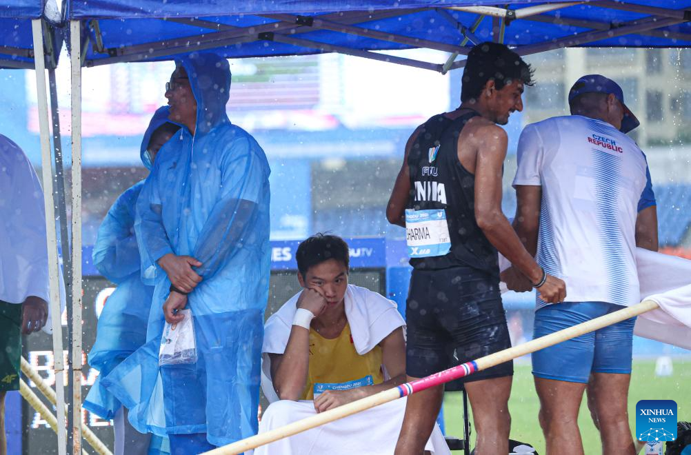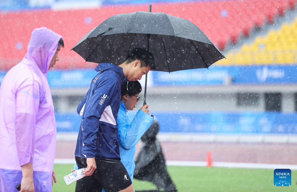 Chen Yesen of China leaves the field of play as heavy rainfall hindered the Pole Vault of the Athletics Men's Decathlon competition at the 31st FISU Summer World University Games in Chengdu, southwest China's Sichuan Province, Aug. 3, 2023. (Xinhua/Li Jing)