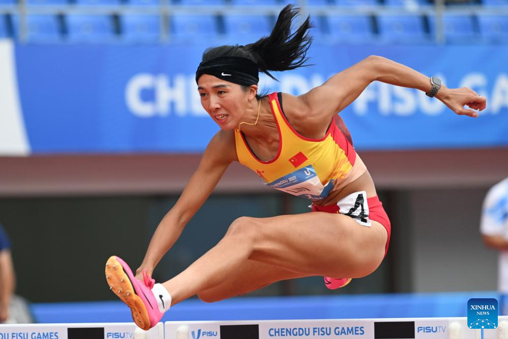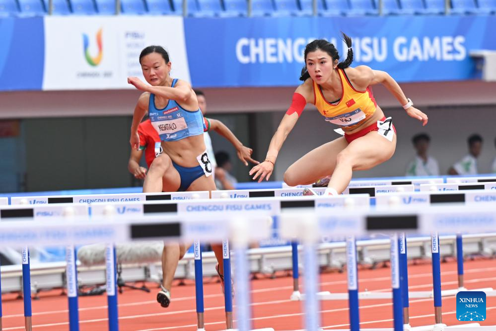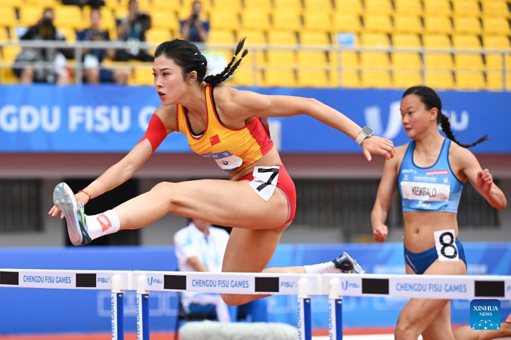 Lin Yuwei of China competes during the Athletics Women's 100m Hurdles Round 1 Heats at the 31st FISU Summer World University Games in Chengdu, southwest China's Sichuan Province, Aug. 3, 2023. (Xinhua/Wang Xi)