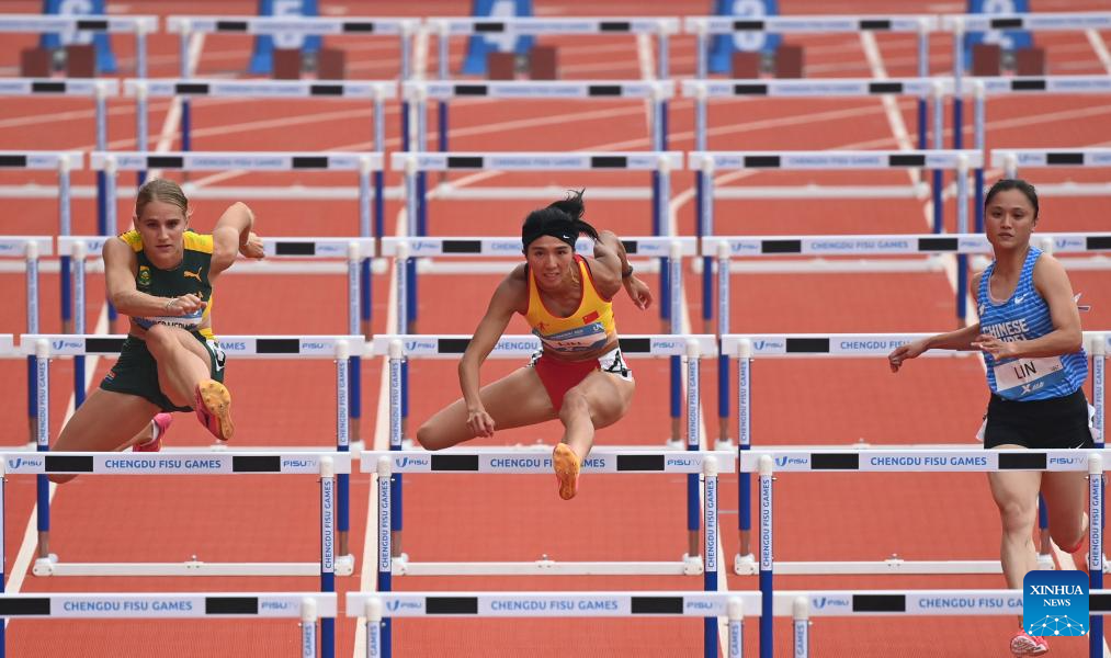 Elsabe Antoinette Van Der Merwe of South Africa, Lin Yuwei of China and Lin Shih-ting of Chinese Taipei (L to R) compete during the Athletics Women's 100m Hurdles Round 1 Heats at the 31st FISU Summer World University Games in Chengdu, southwest China's Sichuan Province, Aug. 3, 2023. (Xinhua/Cai Xiangxin)