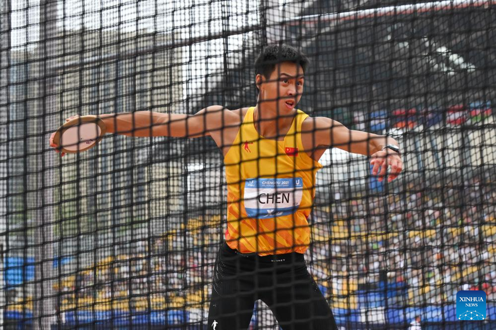 Chen Yesen of China competes during the Discus Throw of the Athletics Men's Decathlon competition at the 31st FISU Summer World University Games in Chengdu, southwest China's Sichuan Province, Aug. 3, 2023. (Xinhua/Wang Xi)