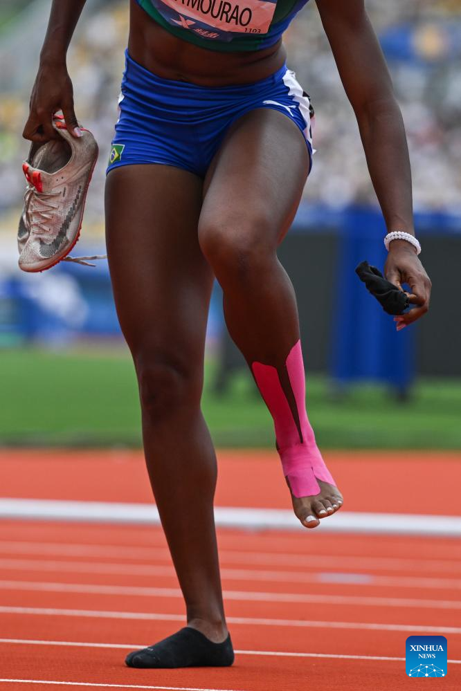Gabriela Silva Mourao of Brazil reacts after competing in the Athletics Women's 200m Round 1 Heats at the 31st FISU Summer World University Games in Chengdu, southwest China's Sichuan Province, Aug. 3, 2023. (Xinhua/Wang Xi)
