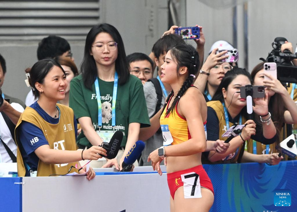 Wu Yanni (front) of China speaks to the reporters after competing in the Athletics Women's 100m Hurdles Round 1 Heats at the 31st FISU Summer World University Games in Chengdu, southwest China's Sichuan Province, Aug. 3, 2023. (Xinhua/Wang Xi)