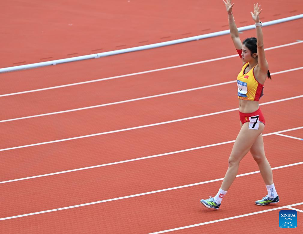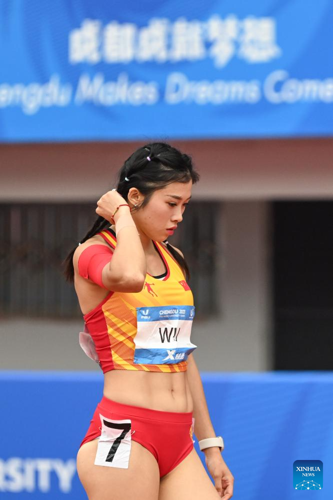 Wu Yanni of China reacts after the Athletics Women's 100m Hurdles Round 1 Heats at the 31st FISU Summer World University Games in Chengdu, southwest China's Sichuan Province, Aug. 3, 2023. (Xinhua/Cai Xiangxin)