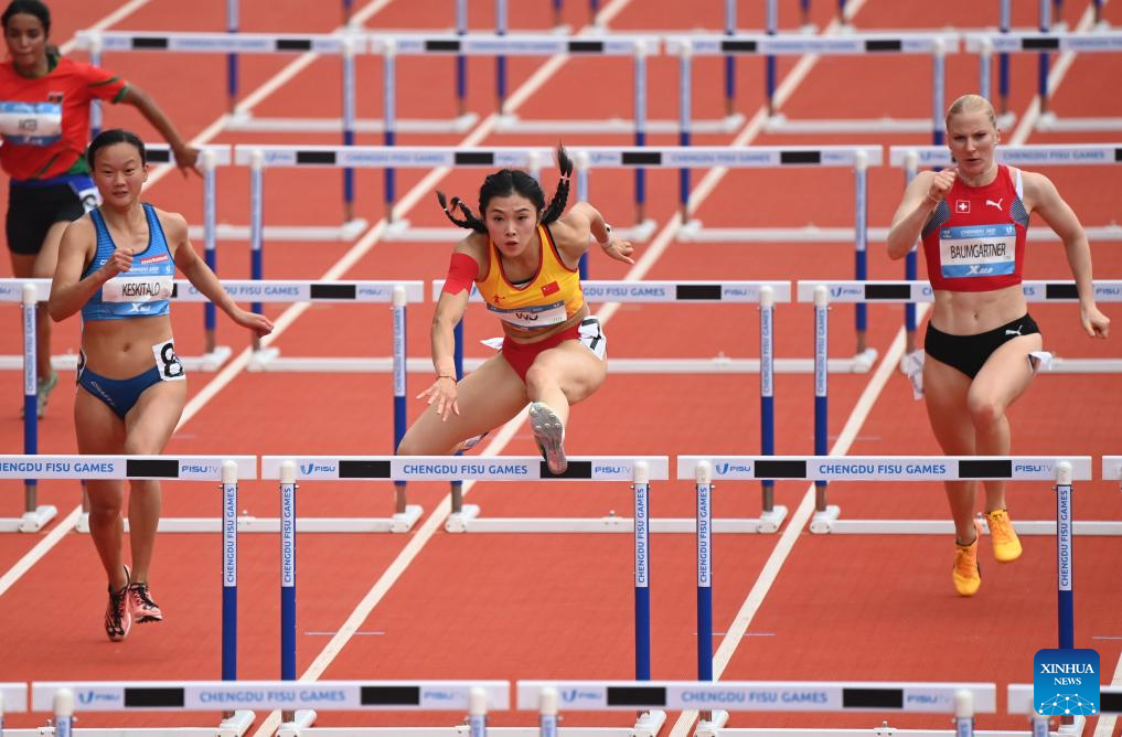 Saara Fu Sofia Keskitalo of Finland, Wu Yanni of China and Meret Annabelle Baumgartner of Switherland (L to R) compete during the Athletics Women's 100m Hurdles Round 1 Heats at the 31st FISU Summer World University Games in Chengdu, southwest China's Sichuan Province, Aug. 3, 2023. (Xinhua/Cai Xiangxin)