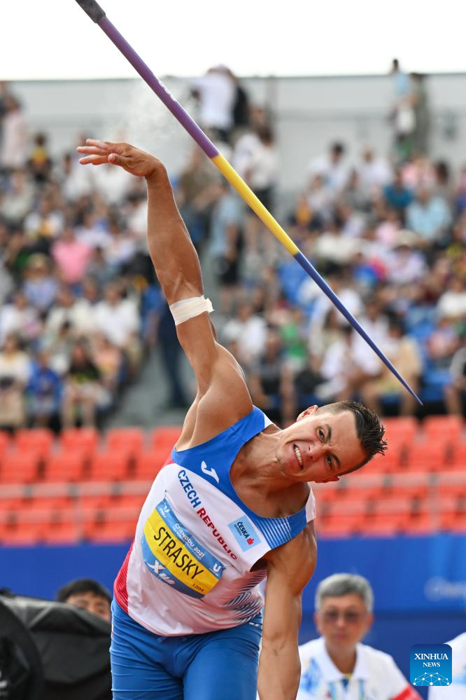 Vilem Strasky of the Czech Republic competes during the javalin throw event of the athletics men's decathlon at the 31st FISU Summer World University Games in Chengdu, southwest China's Sichuan Province, Aug. 3, 2023. (Xinhua/Wang Xi)