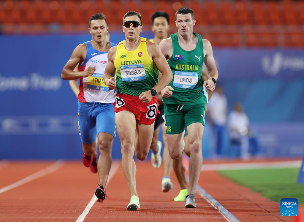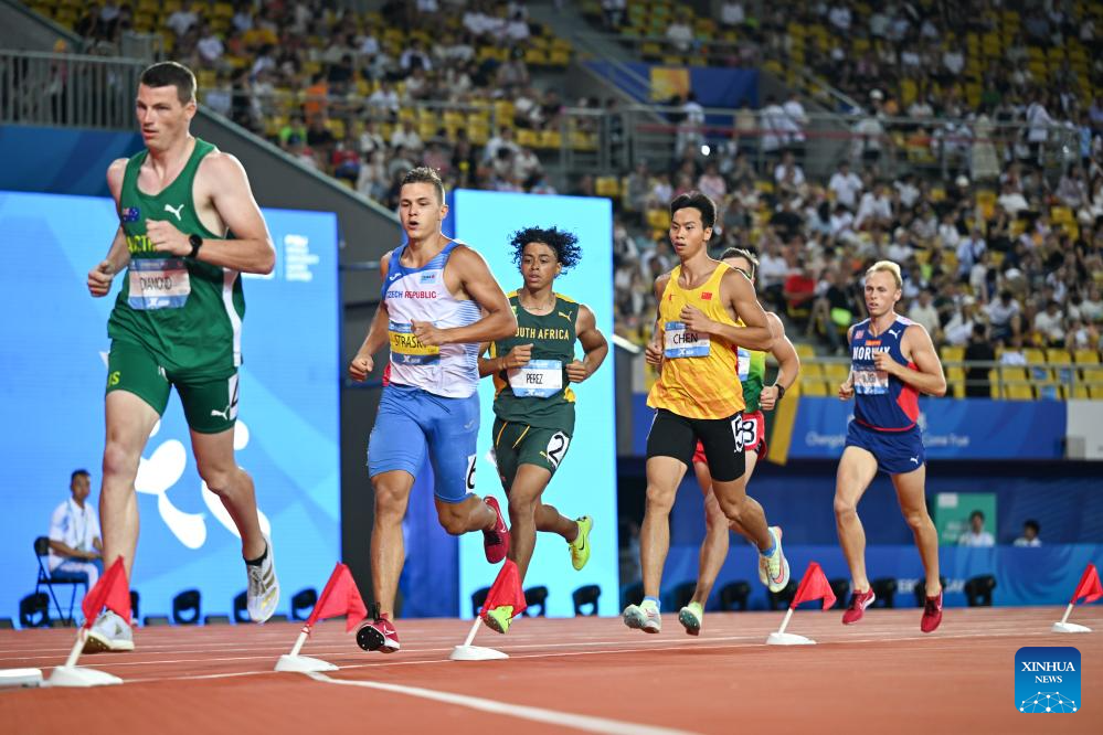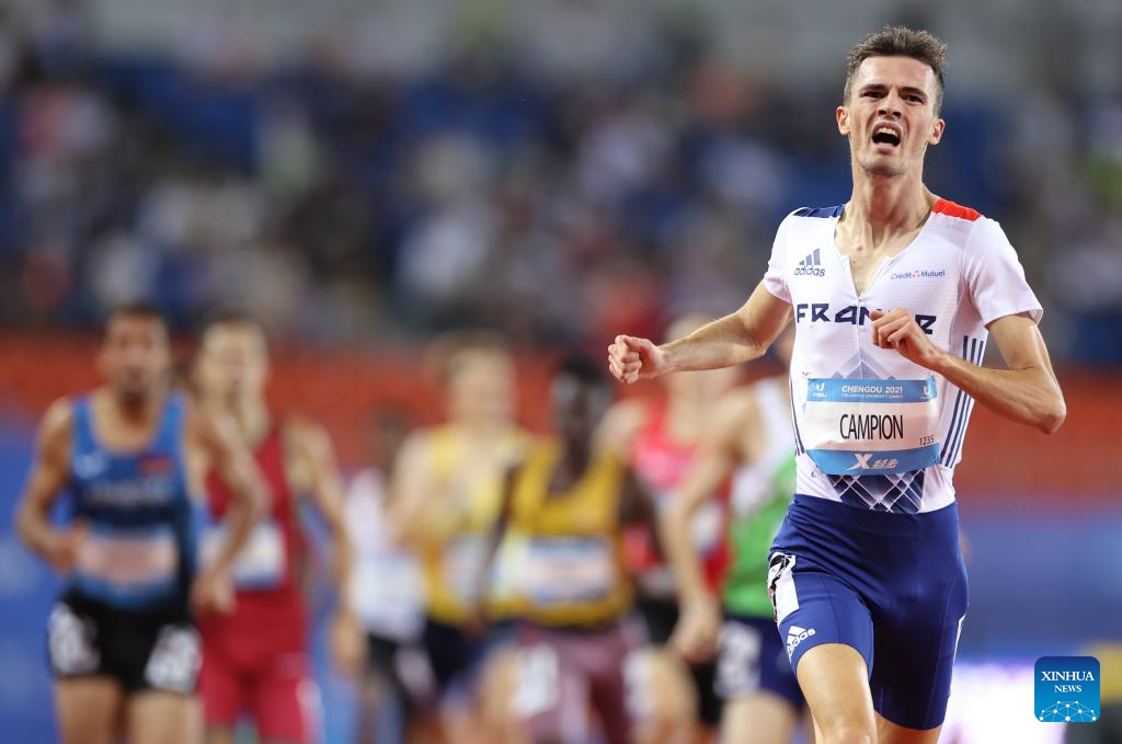 Robert Campion of France races during the athletics men's 1500m final at the 31st FISU Summer World University Games in Chengdu, southwest China's Sichuan Province, Aug. 3, 2023. (Xinhua/Jia Haocheng)