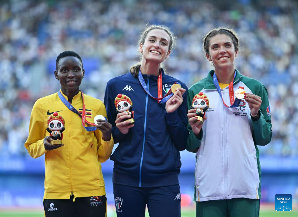 Gold medalist Laura Pellicoro (C) of Italy, silver medalist Knight Aciru (L) of Uganda and bronze medalist Charne Swart of South Africa pose for photos during the awarding ceremony for the athletics women's 800m at the 31st FISU Summer World University Games in Chengdu, southwest China's Sichuan Province, Aug. 3, 2023. (Xinhua/Cai Xiangxin)