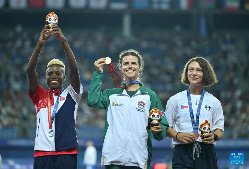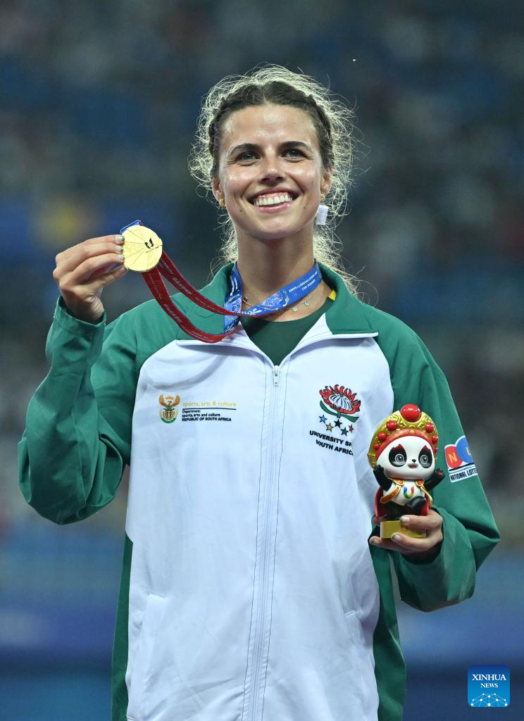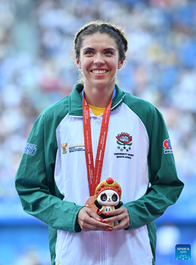 Gold medalist Marlie Viljoen of South Africa poses at the awarding ceremony for athletics women's 400m at the 31st FISU Summer World University Games in Chengdu, southwest China's Sichuan Province, Aug. 3, 2023. (Xinhua/Cai Xiangxin)