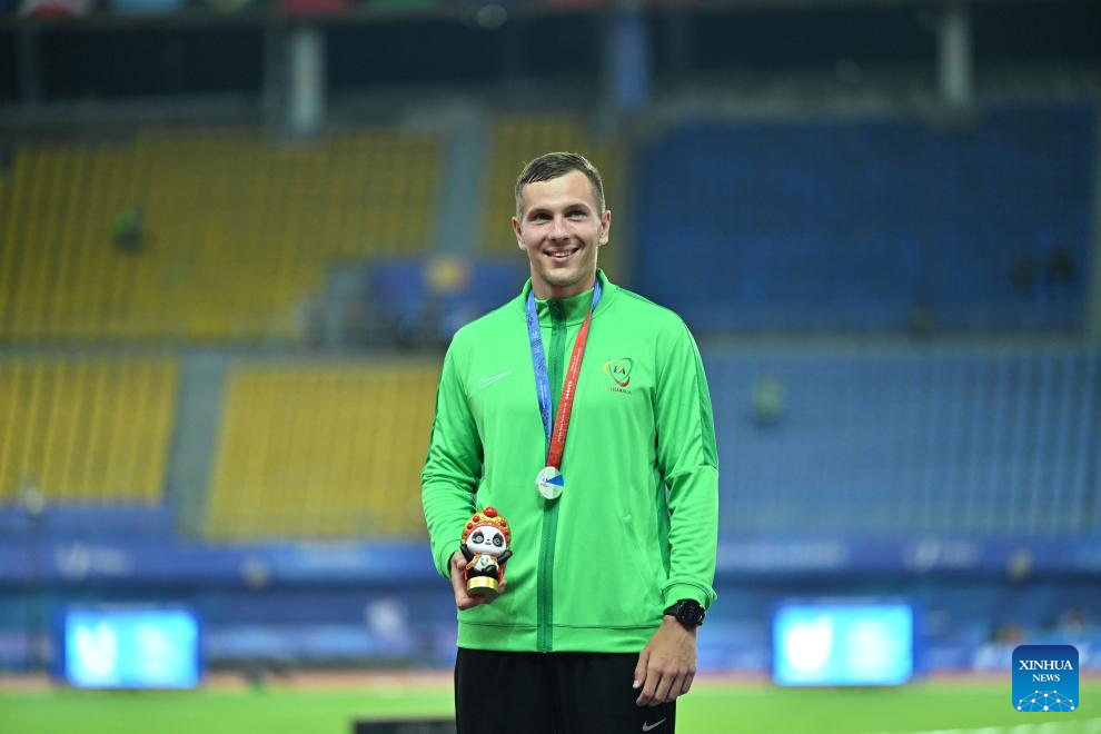 Silver medalist Edgaras Benkunskas of Lithuania poses on the podium during the awarding ceremony for the Men's Decathlon of atletics at the 31st FISU Summer World University Games in Chengdu, southwest China's Sichuan Province, Aug. 3, 2023. (Xinhua/Cai Xiangxin)