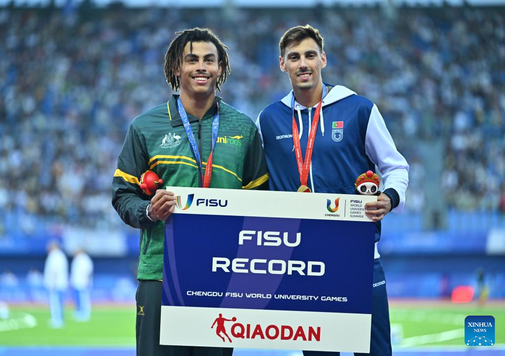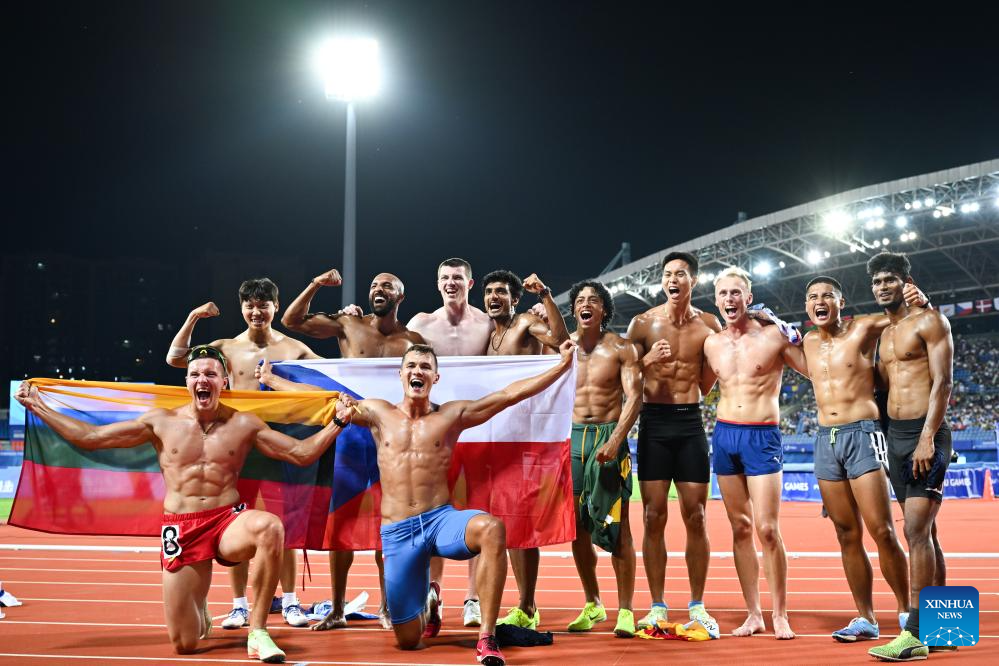 Athletes pose for photos after the athletics men's decathlon at the 31st FISU Summer World University Games in Chengdu, southwest China's Sichuan Province, Aug. 3, 2023. (Xinhua/Wang Xi)